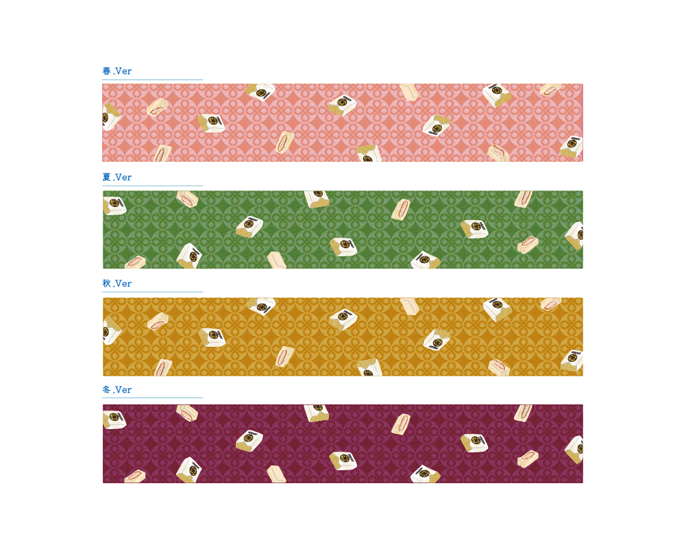 井筒まい泉国内全76店舗にて什器の商品の下に敷く敷布のデザインのご依頼。年4回季節ごとに交換。夕方商品が売れてきた時に棚が寂しくなるため、季節感のあるアートを敷きたいとのご要望。ある程度柄があるもの、家庭的なほっこりしたデザインをご希望されました。オリジナル感のあるパッケージを手書きし下地にまい泉のロゴパターンを柄配置し日本の伝統色を配色し季節感を出しました。ターポリン素材